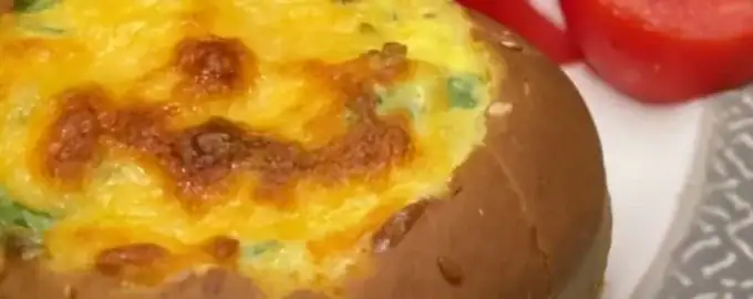 - Κόψτε το κέντρο κάθε ψωμιού. Τοποθετήστε το στήθος μέσα, γεμίστε το μέχρι πάνω με τη γέμιση αυγού και πασπαλίστε με τυρί.