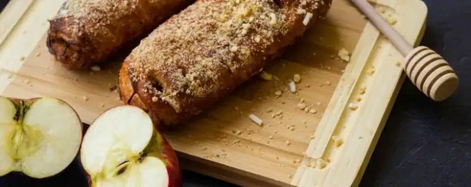 Το ρολό μέλι με μήλα παρασκευάζεται πολύ γρήγορα και εύκολα, καθώς ψήνεται αμέσως με τη γέμιση και δεν χρειάζεται καν μπλέντερ. Το τρυφερό μπισκότο με μέλι ταιριάζει πολύ καλά με τα μήλα.
