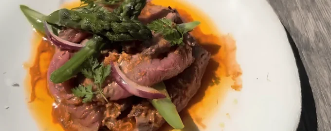 - Τοποθετήστε τις φέτες μοσχαριού σε ένα πιάτο σε σχήμα τριαντάφυλλου, με τα σπαράγγια δίπλα τους. Περιχύστε με τη σάλτσα, πασπαλίστε με αλάτι και, αν θέλετε, προσθέστε μερικές φέτες κόκκινου κρεμμυδιού τουρσί.