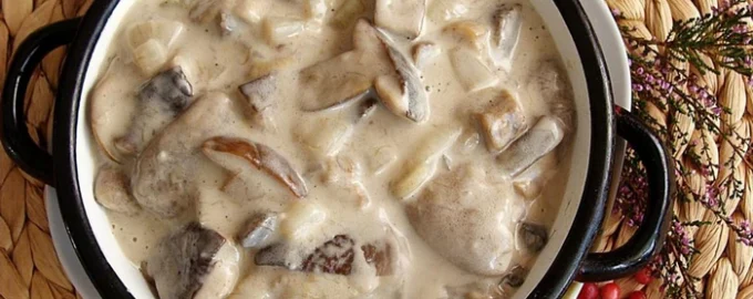- Ρίχνουμε μερικές κουταλιές ξινή κρέμα ή κρέμα γάλακτος και σιγοβράζουμε για άλλα 10-12 λεπτά, ανακατεύοντας συνεχώς.